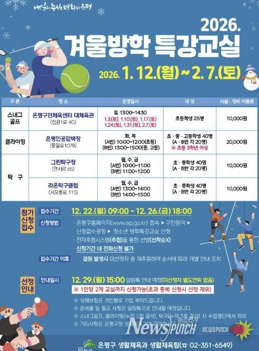 뉴스펀치 김완규 기자 | 서울 은평구는 겨울방학을 맞아 청소년들의 건강증진과 건전한 여가 활동을 지원하기 위해 ‘2026년 청소년 겨울방학 생활체육 특강교실’을 운영한다고 밝혔다.