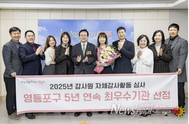 뉴스펀치 김완규 기자 | 영등포구가 감사원 주관 ‘2025년 자체 감사활동 심사’에서 최고 등급인 A등급을 받아 ‘5년 연속’ 최우수기관으로 선정되며 감사원 기관 표창을 수상했다고 밝혔다. 이는 전국 지방자치단체 가운데 유일한 사례로, 구의 체계적이고 선도적인 자체 감사 운영 역량을 다시 한번 입증했다.