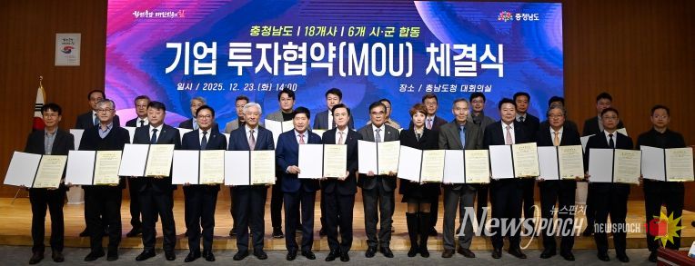 김태흠 지사는 23일 도청 대회의실에서 김석필 천안시장권한대행 등 6개 시군 단체장 또는 부단체장, 박윤수 제이디테크 대표이사 등 18개 기업 대표 등과 투자협약을 체결했다.