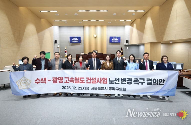 의원들의 구정질문에 이어 정재천 의장이 대표발의한 '수색-광명고속철도 건설사업 노선 변경 촉구 결의안'이 채택됐다. 결의안은 현행 노선이 노량진·대방동 등 대규모 주거 밀집지역을 관통해 주민 안전과 주거환경을 위협하고 있으며, 주민의 의견이 충분히 반영되지 않은 부실한 계획이라고 지적하고, 동작구가 제안한 우회 대안 노선을 기본계획에 반영할 것을 국토교통부에 강력히 촉구하는 내용을 담고 있다.
