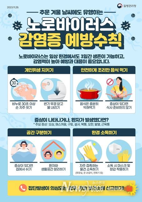또한 노로바이러스 감염증 환자는 증상이 사라진 이후에도 최소 48시간 동안 등원, 등교, 출근을 자제하고 환자가 사용한 공간과 화장실 등 생활공간을 구분해 사용하는 것이 권장된다.