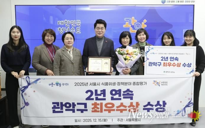뉴스펀치 김완규 기자 | 관악구가 지난 15일 서울시 주관 '2025년 식품 위생·정책분야 종합평가'에서 최우수상을 수상하며, 지난해에 이어 2년 연속 수상의 영예를 안았다.