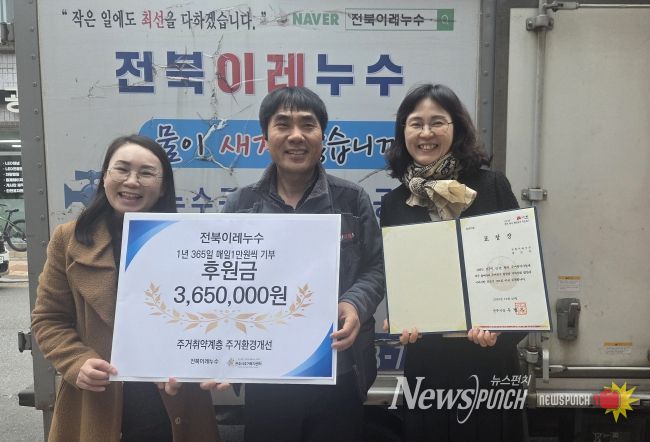 뉴스펀치 정홍균 기자 | 전주지역 종합설비 전문업체인 ‘전북이레누수’(대표 양인수)는 24일 전주시를 찾아 주거 취약 가구의 주거환경 개선을 위한 후원금 365만 원을 전달했다.