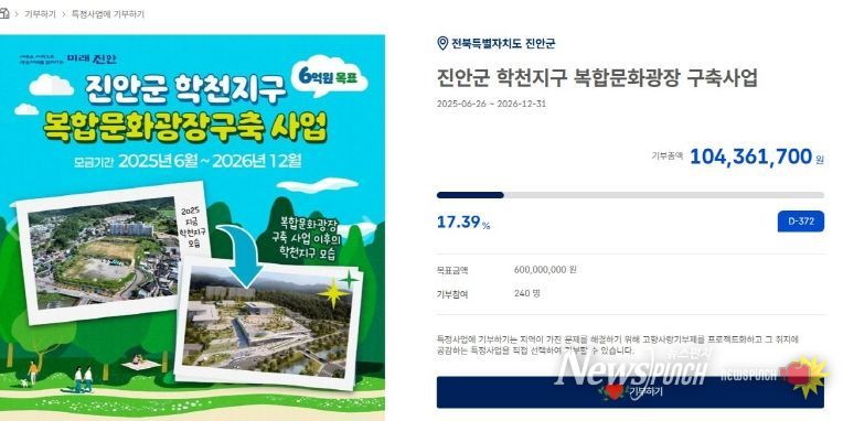 뉴스펀치 정홍균 기자 | 진안군이 고향사랑기부제 지정기부사업으로 지난 6월부터 추진 중인 “학천지구 복합문화광장 구축사업”이 모금 시작 6개월 만에 누적 모금액 1억 원을 달성했다.