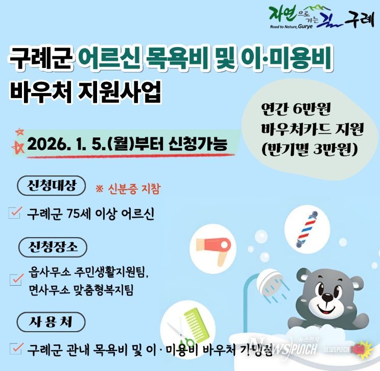 뉴스펀치 강길수 기자 | 구례군은 75세 이상 어르신들의 건강하고 활기찬 노후생활 보장과 지역경제 활성화를 도모하기 위해 '어르신 목욕비 및 이·미용비 바우처 지원사업'을 본격 추진한다고 밝혔다.