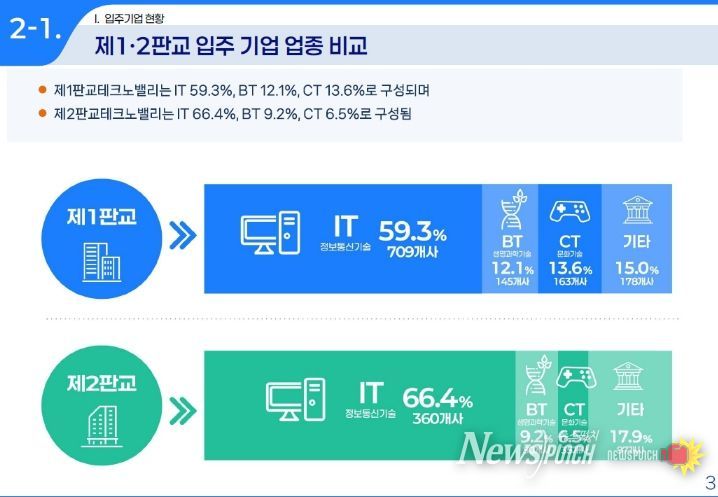 제1판교는 1,196개 기업이 입주해 전년 대비 4% 감소했으나, 제2판교는 584개 기업으로 4% 증가했다. 업종별 구성은 정보기술(IT)이 전체의 61.5%로 가장 높은 비중을 차지했고, 바이오기술(BT)과 문화기술(CT)이 각각 11%로 뒤를 이었다. 기업 규모별로는 중소기업이 85%로 높은 비중을 나타냈으며, 중견기업은 9.3%, 대기업은 3.7%로 나타나 중소기업 중심의 혁신 생태계가 유지되고 있음을 확인했다.