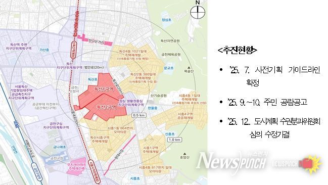 뉴스펀치 김완규 기자 | 서울시는 2025년 12월 24일 '제14차 도시계획위원회 신속통합기획 정비사업 등 수권분과위원회'를 개최하여 ‘독산동 1036일대(독산1구역)’과 ‘독산동 1072 일대(독산2구역)’ 주택정비형 재개발사업 정비구역 지정 및 정비계획 결정(안)을 '수정가결' 했다고 밝혔다.