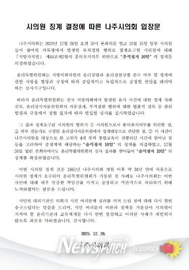 뉴스펀치 김윤걸 기자 | 나주시의회는 2025년 12월 26일 오전 10시 본회의를 열고, 10월 15일 일부 시의원들이 참여한 카톡방에서 발생한 부적절한 행위로 징계요구된 시의원에 대해 '지방자치법' 제44조제2항의 품의유지의무 위반으로 ‘출석정지 10일’의 징계를 의결하고 입장문을 발표했다.