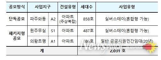 ②택지공모는 약 2천호 규모로 실시하며, 사업 대상지는 파주와동 A2 블록, 원주무실 S1 블록, 의왕초평 A1 블록 총 3곳이다. 파주와동 A2 블록과 원주무실 S1 블록은 실버스테이로, 의왕초평 A1 블록은 임대의무기간이 20년인 일반 공공지원민간임대로 공급한다.