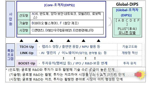 「초격차 프로젝트」는 기본지원(Core-DIPS)과 후속지원(Global DIPS) 등 2단계로 나누어 지원하며, 기술고도화(Tech Up), 개방형 혁신(Link Up),