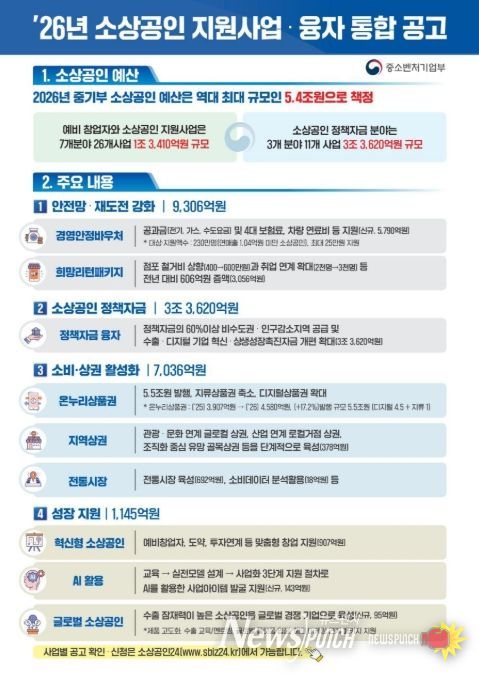 뉴스펀치 조평훈 기자 | 중소벤처기업부는 29일 2026년 소상공인 지원사업·융자 통합 공고를 조기에 시행하여 소상공인의 경영회복과 지속 성장을 뒷받침하기 위해 총 7개 분야의 다양한 정책 사업을 추진한다고 밝혔다.