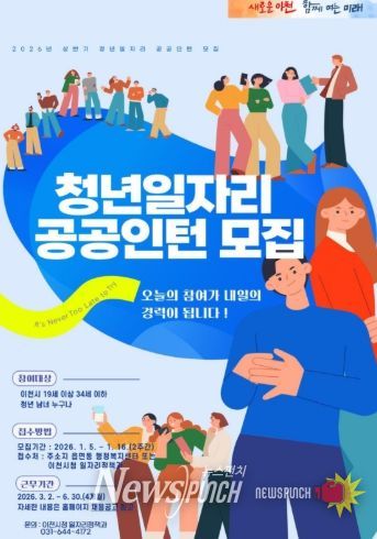 뉴스펀치 김길룡 기자 | 이천시는 2026년 1월 5일부터 1월 16일까지 ‘청년일자리 공공인턴사업’의 상반기 참여자 47명을 모집한다.