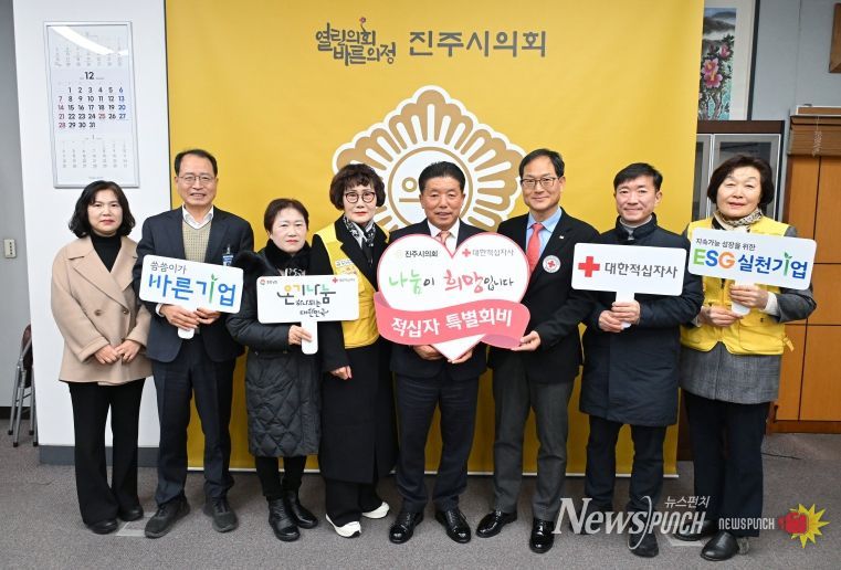 뉴스펀치 김길룡 기자 | 진주시의회는 30일 경남적십자사와 적십자봉사회 진주시협의회 관계자들이 참석한 가운데 2026년도 적십자 특별회비 전달식을 가졌다.