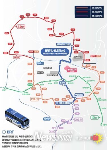 뉴스펀치 김길룡 기자 | 광주시가 대규모 도시개발로 교통 혼잡이 예상되는 광천권역에 도입하는 ‘백운~매곡 간선급행버스체계(BRT)’ 구축 사업을 올해 본격 추진한다.