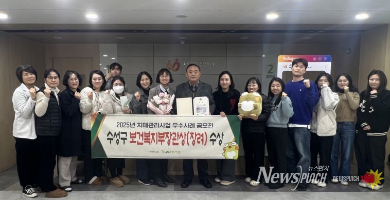 뉴스펀치 조평훈 기자 | 대구 수성구 치매안심센터(센터장 여수환)는 보건복지부와 중앙치매센터가 공동주최한 ‘2025년 치매관리사업 우수사례 공모전’에서 ‘치매환자 및 보호자 지원’ 분야의 우수성을 인정받아 보건복지부장관상을 수상했다고 밝혔다.