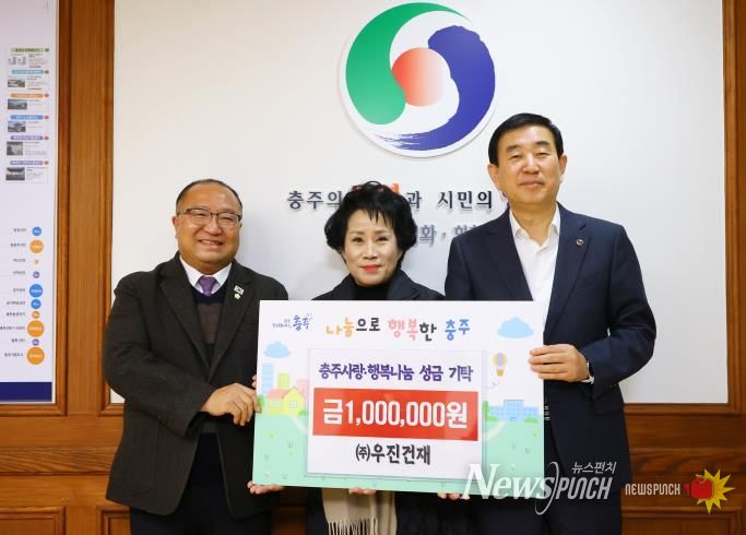 뉴스펀치 김길룡 기자 | 충주시는 지역기업 우진건재가 시청을 방문해 어려운 이웃을 위한 ‘충주사랑행복나눔’ 기금 100만 원을 기탁했다고 2일 밝혔다.