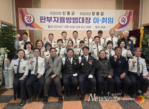 뉴스펀치 김길룡 기자 | 원주시 판부면자율방범대는 지난달 31일 자율방범대원과 관계자 등 80여 명이 참석한 가운데, 제8대 장용길 신임 대장과 제7대 신종균 전 대장의 이·취임식을 개최했다.