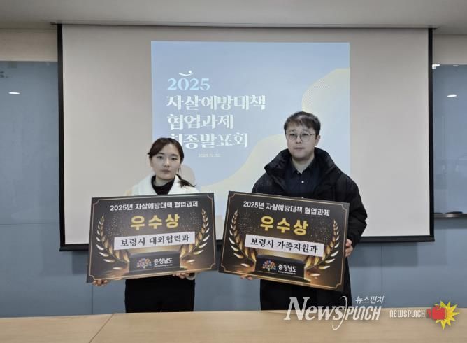 뉴스펀치 김길룡 기자 | 보령시가 충청남도가 주관한 ‘2025년 자살예방대책 협업과제’ 평가에서 우수한 성과를 거뒀다. 대외협력과와 가족지원과가 각각 제출한 두 개 과제가 최종 발표 심사에서 우수상을 받았다.