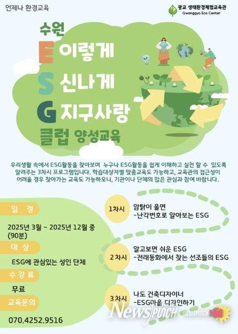 뉴스펀치 김길룡 기자 | 광교 생태환경체험교육관이 운영 중인 ‘수원 환경·사회·지배구조(ESG)클럽 양성교육’과 ‘환경·사회·지배구조(ESG) 환경교실-환경·사회·지배구조(ESG) 정조처럼’ 교육과정이 기후에너지환경부가 주관한 우수환경교육프로그램으로 지정됐다.