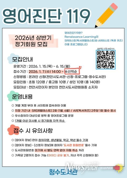 뉴스펀치 김길룡 기자 | 천안시 청수도서관은 지난해에 이어 올해도 영어 학습 프로그램 ‘영어진단 119’를 운영한다고 2일 밝혔다.