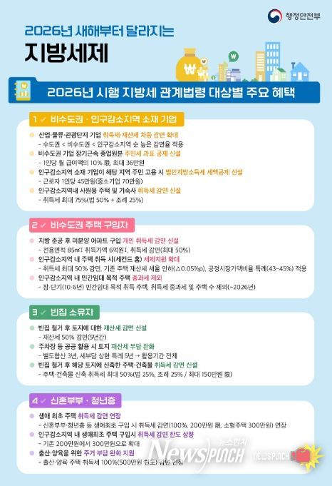 뉴스펀치 김길룡 기자 | 행정안전부는 '지방세법', '지방세특례제한법'개정안이 12월 30일 국회 본회의를 통과해 새해부터 시행된다고 밝혔다.