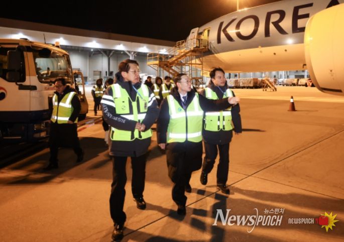뉴스펀치 김길룡 기자 | 이명구 관세청장은 1월 1일 새해 첫 현장 일정으로 인천공항 대한항공 화물터미널을 방문하여 반도체 수출화물 통관 현장을 점검했다. 이 청장은 현장 관계자들과 새해 인사를 나누고, 수출 현장에서 묵묵히 역할을 수행해 온 관계자들의 헌신에 감사를 전했다.