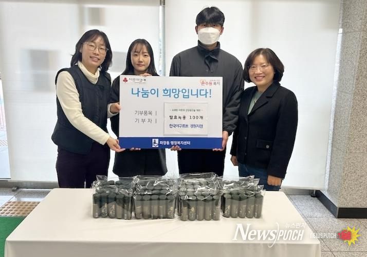 장인영 파장동장은 “연말을 맞아 지역 내 어려운 이웃을 위해 따뜻한 나눔을 신천해 주신 한국야구르트 경원지점에 깊이 감사드린다”며 “전달해 주신 물품을 도움이 꼭 필요한 저소득 가구에 소중히 전달하여 따뜻한 연말을 보낼 수 있도록 하겠다”고 전했다.