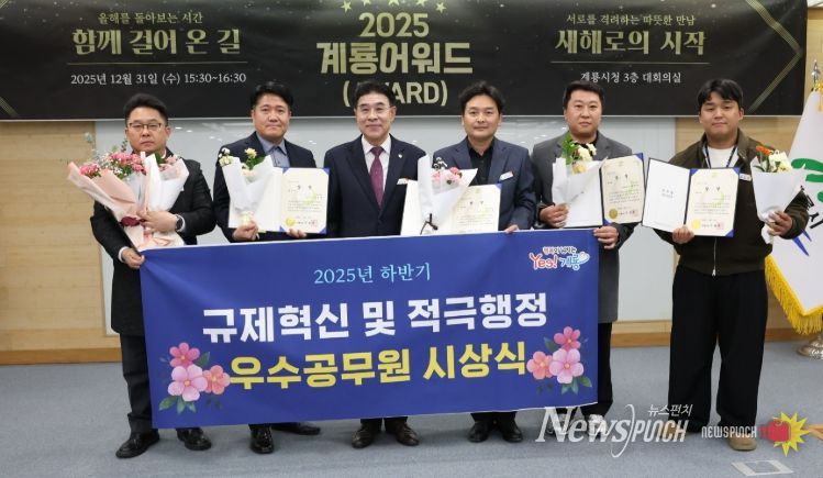 뉴스펀치 김길룡 기자 | 계룡시는 지난 12월 31일 시청 대회의실에서 ‘2025년 하반기 계룡시 규제혁신 및 적극행정 우수공무원 시상식’을 열고, 창의적이고 능동적인 업무 추진으로 시민 불편 해소와 행정 혁신에 기여한 공무원들을 격려했다.