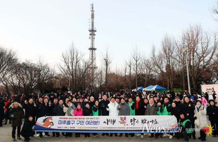 뉴스펀치 김길룡 기자 | 인천 미추홀구는 지난 1월 1일 수봉공원에서 구민 900여 명이 참석한 가운데 병오년 새해 해맞이 행사를 진행했다.