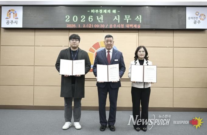 뉴스펀치 김길룡 기자 | 공주시는 2일 시청 대백제실에서 열린 시무식에서 시장을 비롯한 공직자 대표가 ‘2026년 공직자 청렴 다짐 선언문’을 함께 낭독하며 청렴 실천 의지를 다졌다고 밝혔다.