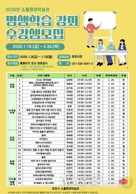 뉴스펀치 김길룡 기자 | 포천시는 오는 12일까지 소흘평생학습관에서 운영하는 2026년 1기 정규 평생학습 프로그램 수강생을 모집한다.