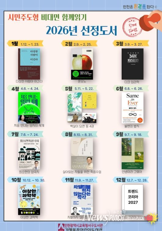 뉴스펀치 김길룡 기자 | 인천광역시교육청서구도서관은 12월 31일 ‘2026년 시민주도형 비대면 함께읽기’ 도서 15권을 선정·발표했다.
