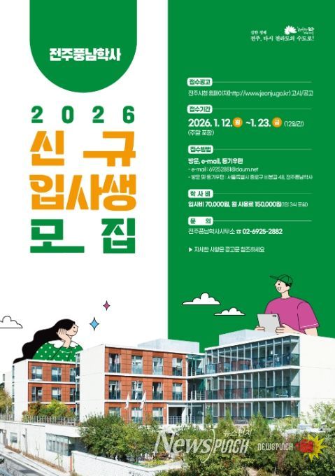 뉴스펀치 김길룡 기자 | 인재 양성의 요람인 전주시 서울장학숙 전주풍남학사가 2026년도 신규입사생을 모집한다.