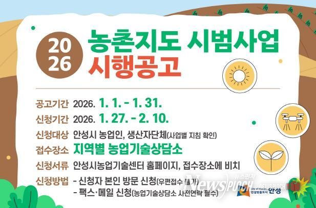 뉴스펀치 김길룡 기자 | 안성시농업기술센터는 1월 1일부터 2월 10일까지 ‘2026년도 농촌지도 시범사업’ 시행 공고에 따른 신청자를 모집한다.