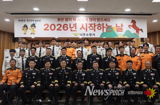 뉴스펀치 김윤걸 기자 | 나주소방서는 2일 2026년 새해를 맞아 시무식 행사를 개최하고 한 해 동안의 각오를 다지며 지역 안전 강화를 위한 힘찬 출발을 알렸다.