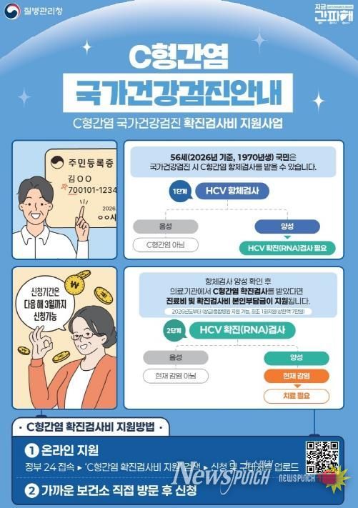 지원 대상은 56세 국가건강검진에서 C형간염 항체 양성판정을 받고 확진 검사(HCV RNA)를 받은 시민(2026년 기준 1970년생)으로, 확진 검사 시 수반되는 진찰료와 검사비 본인부담금을 최초 1회에 한해 최대 7만 원까지 지원한다.