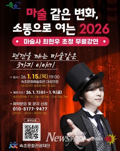 뉴스펀치 조평훈 기자 | 속초문화관광재단이 오는 1월 15일 오후 7시, 속초문화예술회관 대공연장에서 마술사 최현우를 초청해 강연과 퍼포먼스가 결합한 기획공연 ‘마술 같은 변화, 소통으로 여는 2026’을 개최한다.