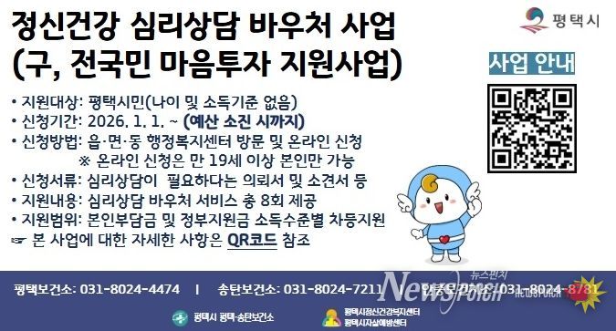 뉴스펀치 박상훈 기자 | 평택시에서는 시민의 마음 건강을 지키고 자살 예방 및 정신질환 조기 발견을 돕기 위한 ‘정신건강 심리상담 바우처사업’을 2026년에도 계속 추진한다.