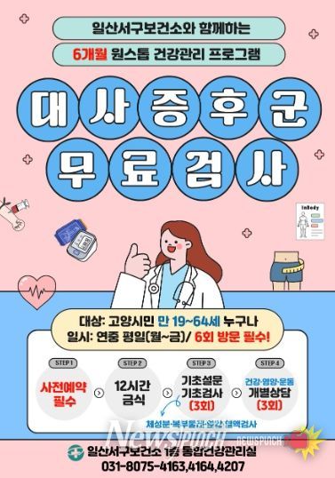 뉴스펀치 박상훈 기자 | 고양특례시 일산서구보건소는 대사증후군 검진 및 맞춤형 건강상담을 한 곳에서 받을 수 있는‘건강원스톱서비스’를 연중 상설 운영한다.
