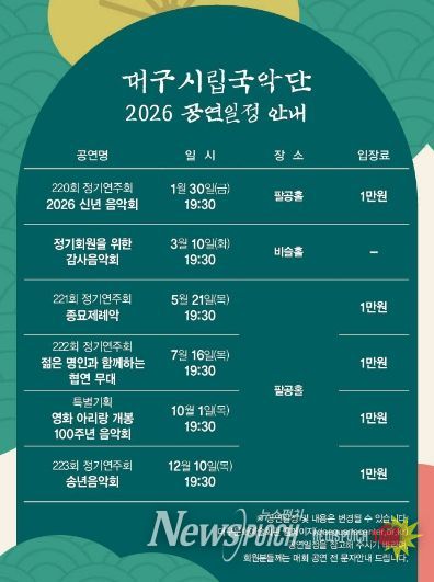 뉴스펀치 조평훈 기자 | 대구시립국악단은 전통문화예술을 활성화하고 시민들에게 보다 폭넓은 문화 혜택을 제공하고자 2026년 연간 정기회원을 모집한다.