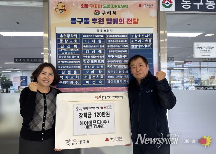 뉴스펀치 박상훈 기자 | 구리시 동구동 행정복지센터는 6일, 에이에프티㈜로부터 취약계층 대학생을 위한 장학금 120만 원을 기탁받았다고 밝혔다.