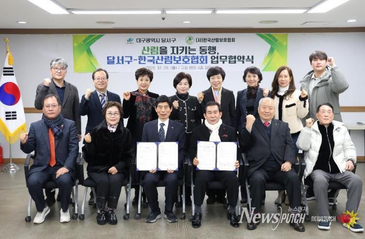 뉴스펀치 조평훈 기자 | 대구 달서구는 구청에서 사단법인 한국산림보호협회와 산림의 가치 증진과 체계적인 산림보호를 위한 업무협약(MOU)을 체결하고, 기후위기 시대 지속가능한 녹색도시 조성을 위한 민관 협력에 본격적으로 나선다.