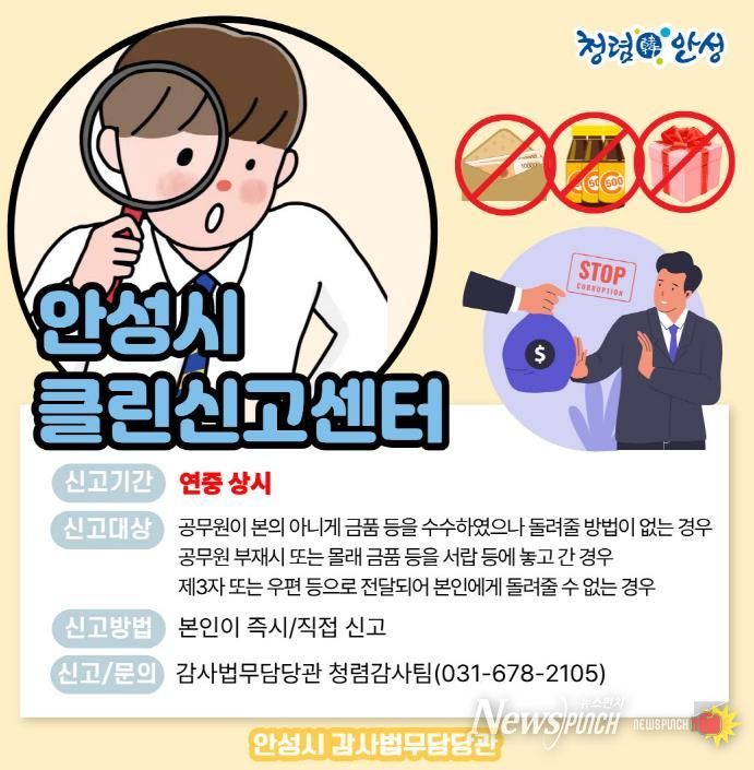 뉴스펀치 박상훈 기자 | 안성시는 시민들에게 신뢰받는 공정하고 투명한 행정 서비스를 제공하기 위해 ‘클린신고센터’를 연중 상시운영하며 청렴한 행정문화 정착에 힘쓰고 있다고 밝혔다.
