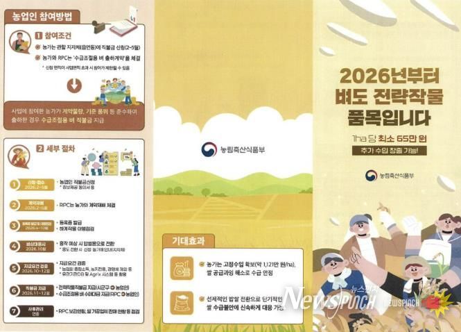 뉴스펀치 이현승 기자 | 홍성군은 국립농산물품질관리원 충남지원 홍성사무소(사무소장 신형중, 이하 홍성농관원)에서 쌀 공급 과잉 문제를 해소하고 농가 소득을 안정적으로 지원하기 위해 2026년부터'수급조절용 벼'를 전략작물직불제 품목으로 새롭게 추가한다고 밝혔다. 이에 따라 벼 재배 농가에서는 기존 일반 벼 재배보다 더 높은 수익을 올릴 수 있는 기회가 열릴 전망이다.