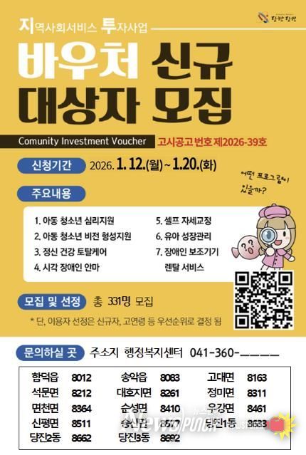 뉴스펀치 이현승 기자 | 당진시는 1월 12일부터 20일까지 2026년 상반기 지역사회서비스투자사업 이용 대상자 331명을 모집한다고 8일 밝혔다.