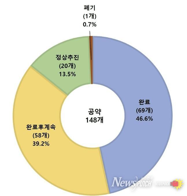 공약 완료율은 85.8%(127개)다. 공약 이행률 96.1%는 완료사업(69개·이행률 100%)과 완료 후 계속 추진(58개·이행률 100%), 정상 추진(20개) 중인 사업별 추진 정도를 백분율로 환산한 평균값이다.