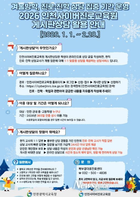 뉴스펀치 정홍균 기자 | 인천광역시교육청은 겨울방학을 맞아 중·고등학생들이 새 학년 준비 과정에서 진로와 학업에 대한 고민을 해소할 수 있도록, 인천사이버진로교육원 ‘겨울방학 상담 집중 기간’을 1월부터 2월까지 운영한다.