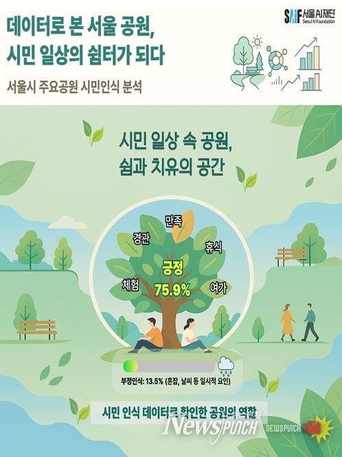 뉴스펀치 박상훈 기자 | 서울시민 75.9%는 ‘공원’에 만족·휴식·경관·체험 등 정서적 호감을 표현하며 긍정적으로 인식하는 것으로 나타났다. 또 SNS·커뮤니티 상에서 9~10월에 ‘공원’을 자주 언급하고, 공원과 관련한 연관어로 ‘시간·시작·생각·카페’ 등을 많이 사용하는 것으로 분석됐다.