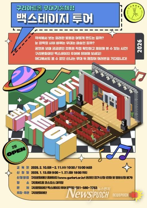 뉴스펀치 박상훈 기자 | 구리문화재단은 〈무대 기술 체험 백스테이지 투어 프로그램〉 참가자를 오는 1월 13일 오전 9시부터 1월 27일 오후 6시까지 재단 홈페이지를 통해 선착순 모집한다고 밝혔다.