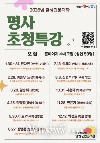 뉴스펀치 조평훈 기자 | 대구 달성군립도서관은 2026년 한 해 동안 지역 주민들을 위한 ‘명사초청특강’을 진행한다고 8일 밝혔다.